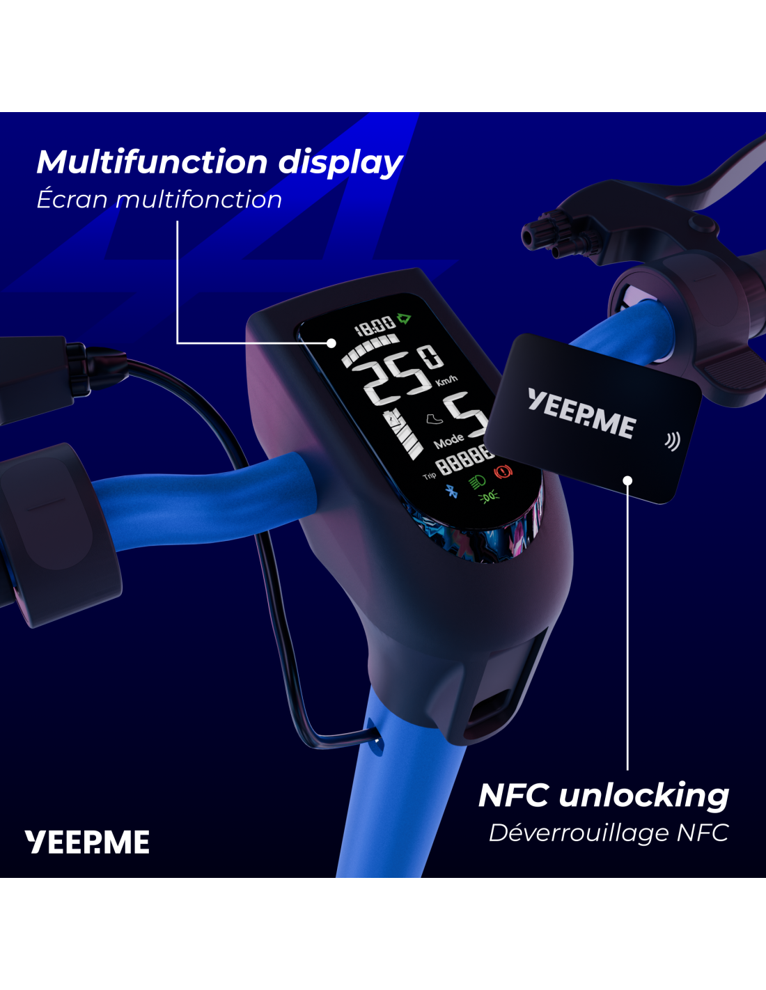 - Nouveau Tableau de bord digital XL avec indication de l'heure, de la vitesse, distance parcourue, des éclairages, des clignotants et des modes de conduite. 5 modes dont 1 mode Individual paramétrable avec l’application yeep.me