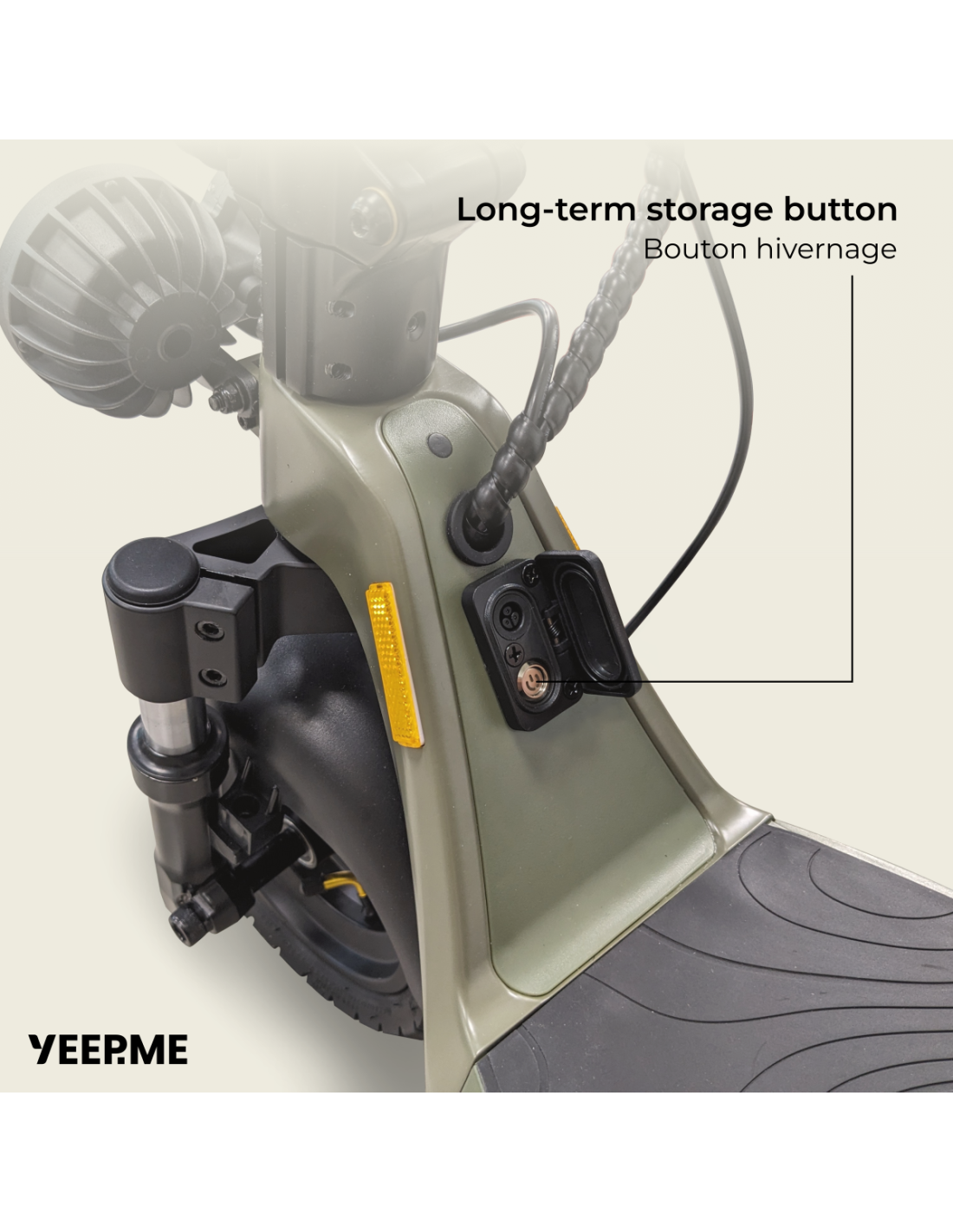 Cette trottinette est également équipée d’un bouton « hivernage » situé à proximité du connecteur de charge. Ce bouton vous permettra de mettre la batterie sous protection lors d’une non-utilisation prolongée. Il est recommandé de recharger la batterie et d’activer le bouton hivernage afin de préserver la durée de vie de la batterie lors d’une non utilisation supérieure à 1 mois.