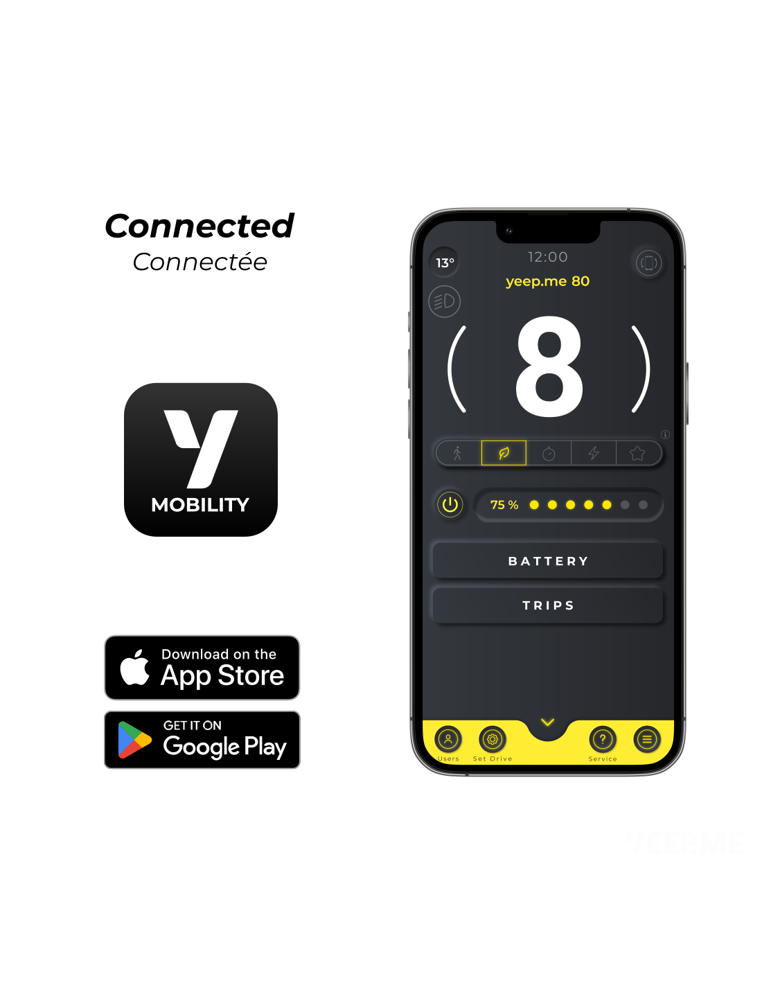 Equipée d’une connexion Bluetooth, elle est connectée grâce à l’application YEEP.ME Mobility accessible dans les « stores » pour smartphones iOS et Google Android. L’application permettra :