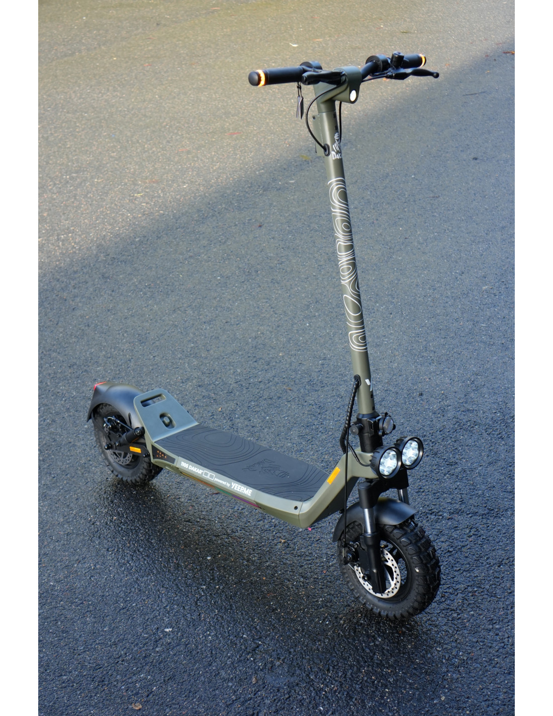 Livrée dans un coloris exclusif KAKI CLAIR, avec motifs et logos DAKAR™ elle se positionne comme une trottinette de type SUV performante pour le quotidien.