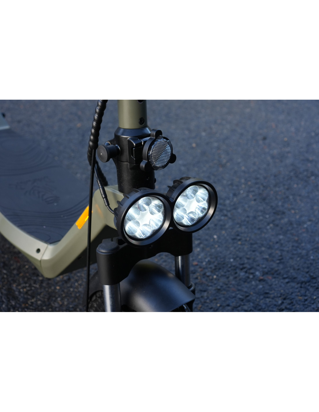 - Système d’éclairage Evolué : Triple phare AVANT LED (1x Guidon + 2x haut de fourche), Feu LED arrière avec Feu stop, Réflecteurs, LED latérales multicolores sur le plateau, Clignotants : avant guidon et arrière plateau avec commande au guidon et voyant au tableau de bord