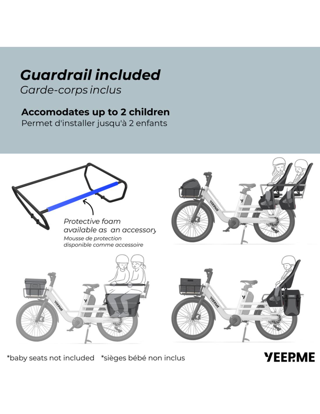 Selon l'âge de vos enfants, vous pourrez soit installer le garde-corps + 1 ou 2 sièges bébé (non fournis), soit installer le Kit confort et les coussins d'assise... ou bien mixer en installant le garde-corps + 1 coussin pour enfant et 1 siège bébé (non fourni)