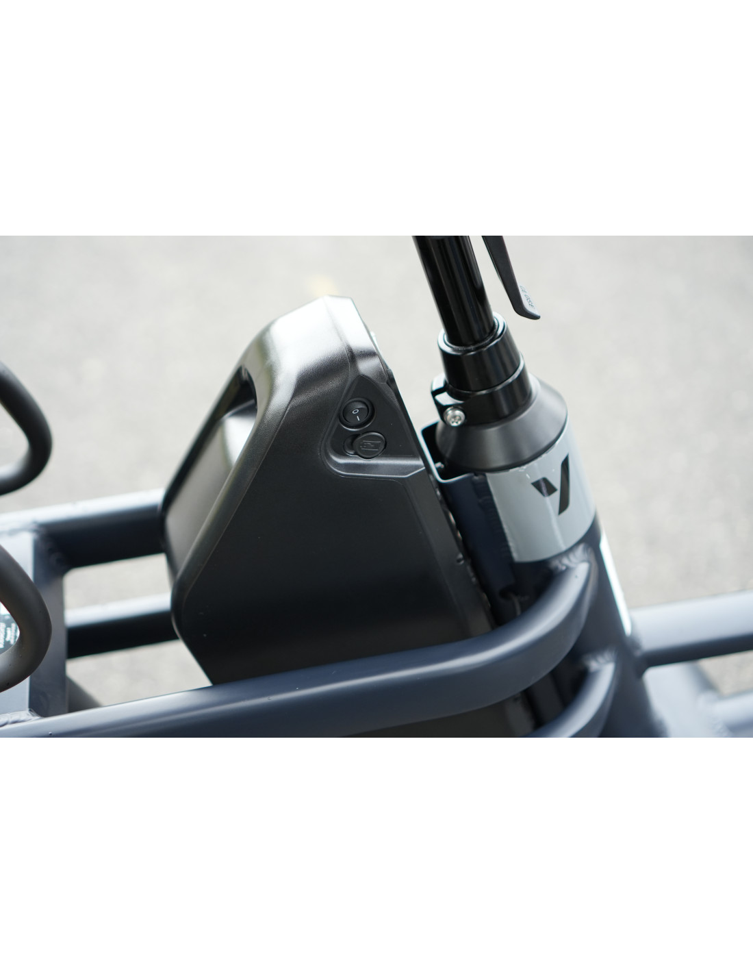 Boutons de commande au pouce gauche : allumage des feux, et changement de vitesse et bouton fonction assistance d’aide au démarrage mode piéton 6kmh.