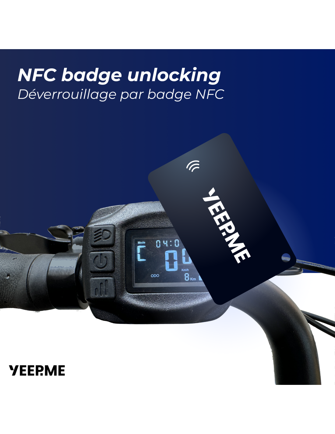 Il est protégé par un verrouillage du système électronique pilotant toute la partie électrique dont le moteur. Pour allumer le système électrique, il suffit d’utiliser le badge NFC (2 badges fournis).