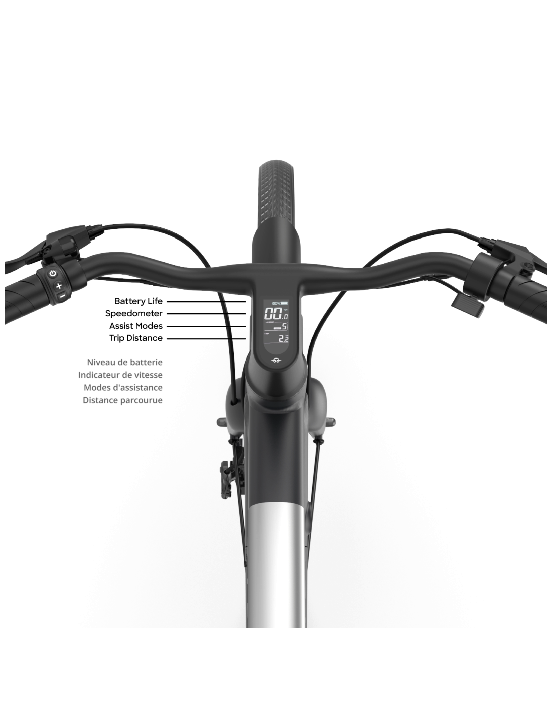 - Ecran intégré au guidon: vitesse, distance parcourue, niveau de batterie et 5 modes d’assistance