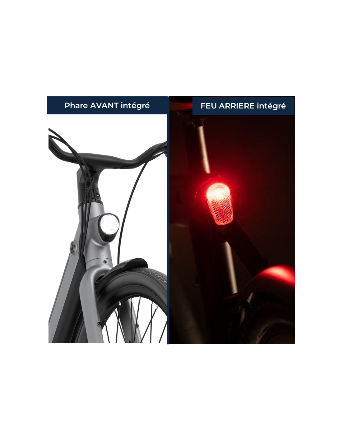 7 vitesses Shimano, Ecran intégré, Feux intégrés au cadre.