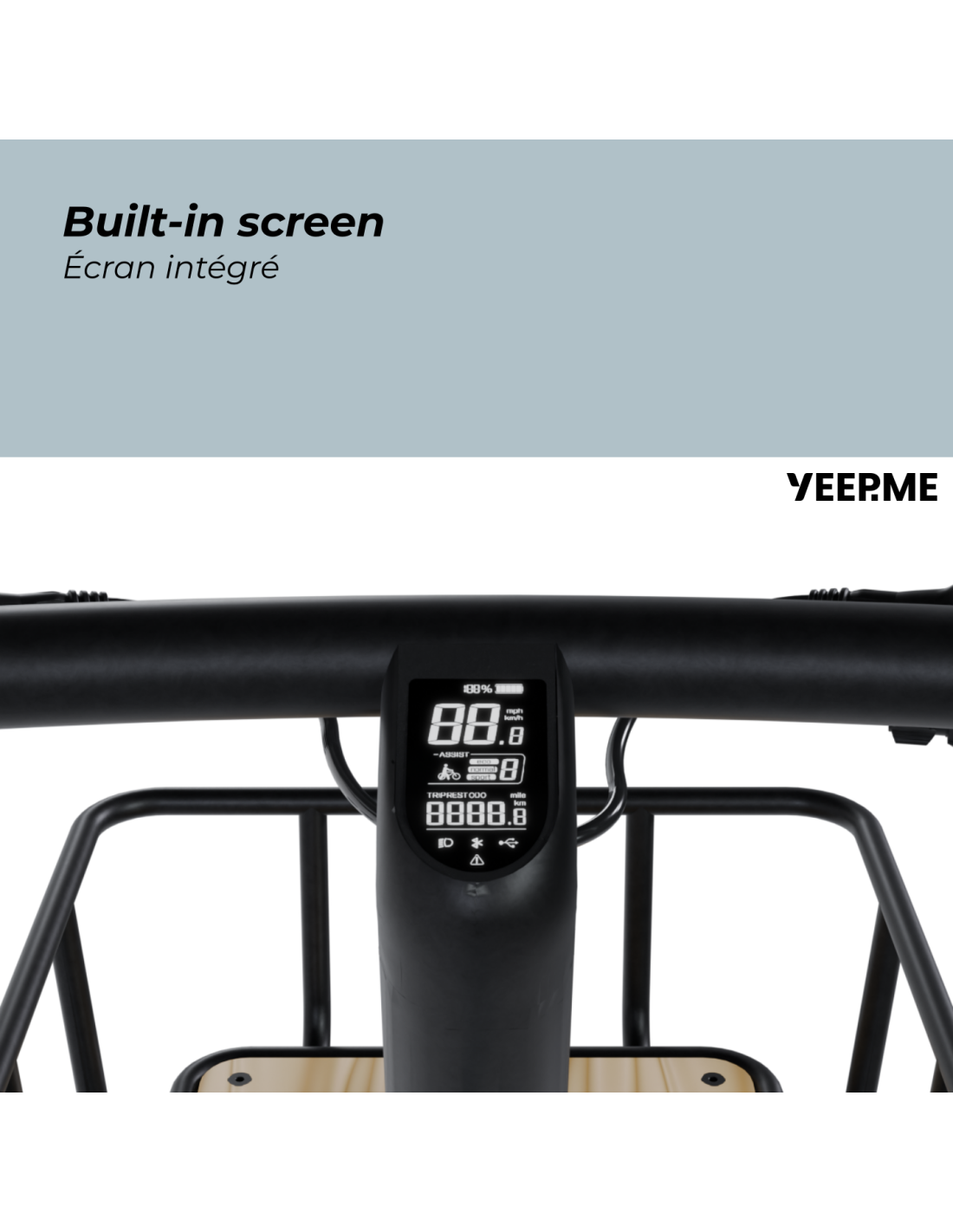 - Écran central LED Intégré. Affichage : niveau de batterie, distance, vitesse. Boutons : allumage des feux, changement de modes.